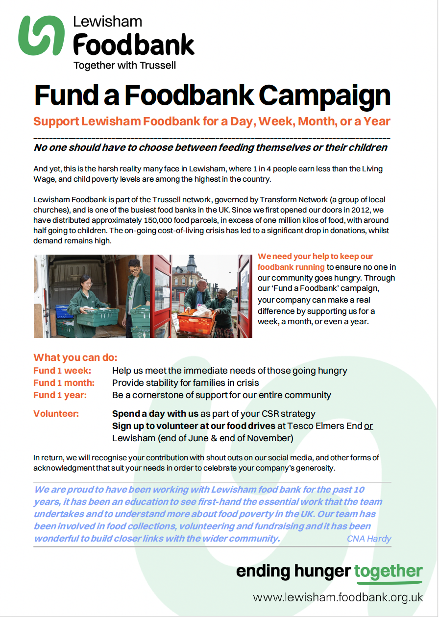 Contact us to discuss how a partnership with Lewisham Foodbank can support your business objectives while making a tangible difference in our community.