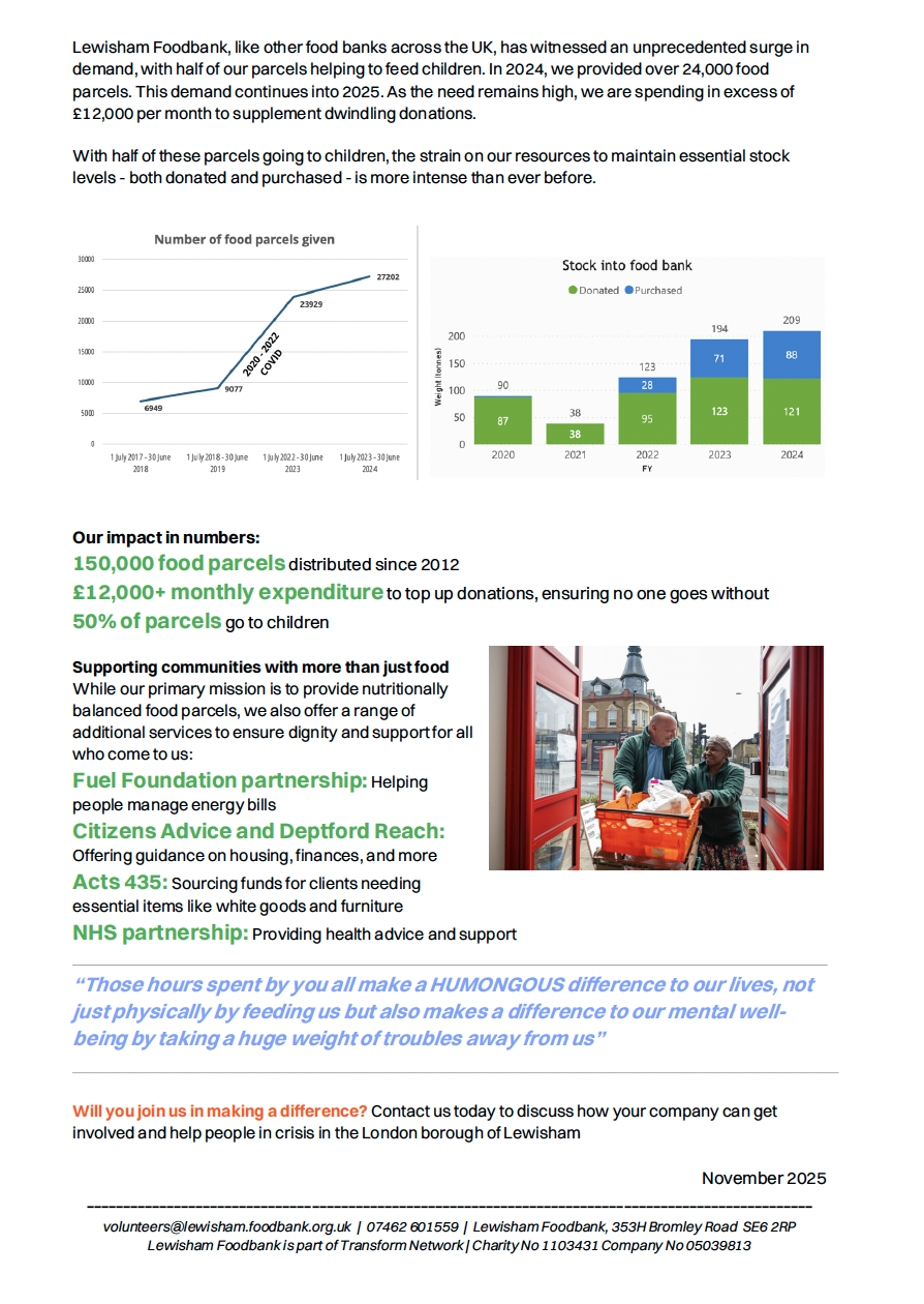 A partnership with Lewisham Foodbank provides clear, outcome‑focused benefits to your business.